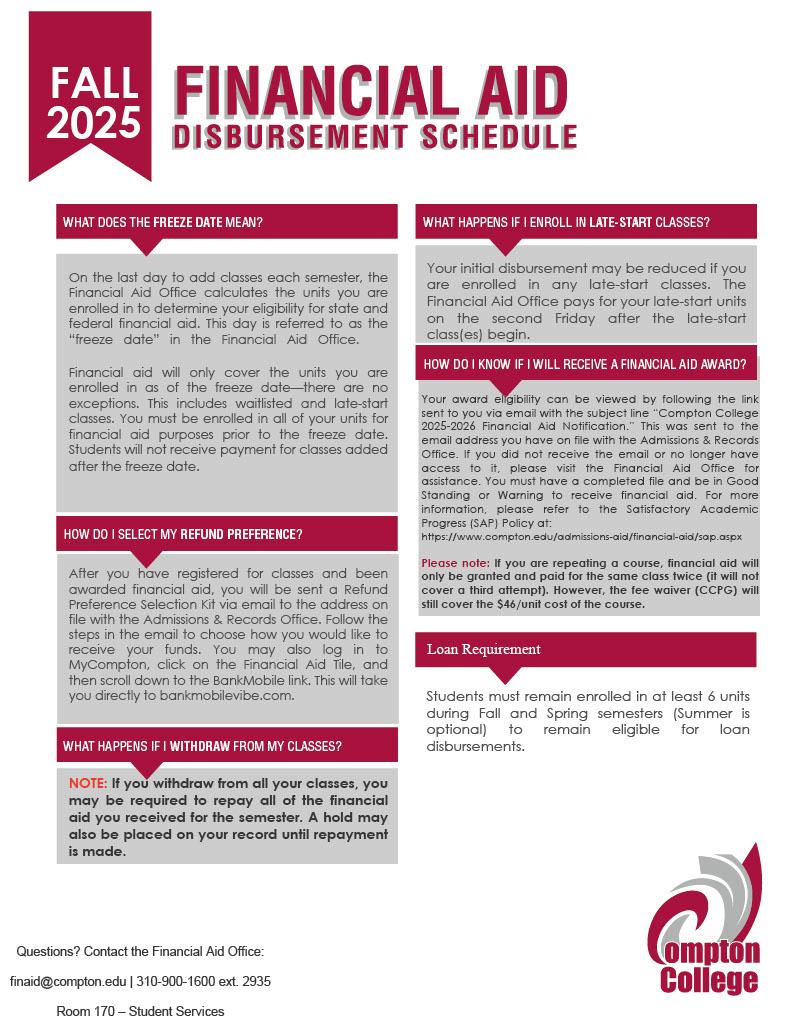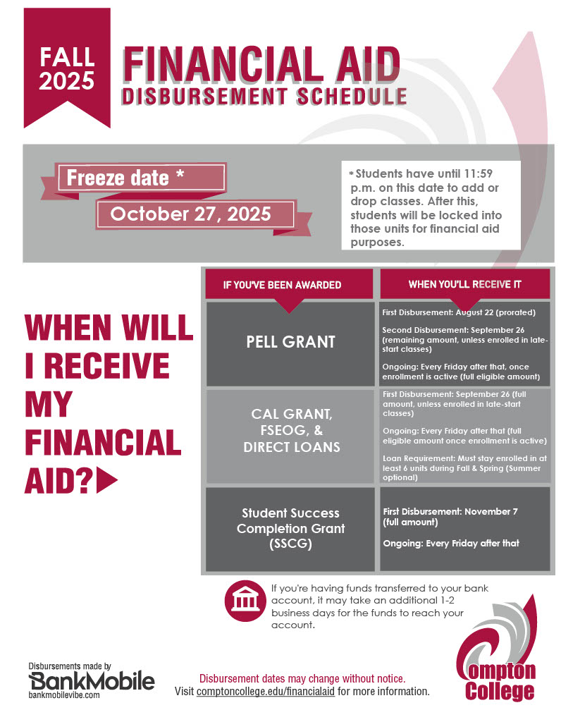 Financial aid disburses at different points throughout the semester. Please review the disbursement schedule for dates for each semester (fall, spring, and summer). To ensure your financial aid disburses on time, make sure all your requirements are completed in MyCompton at least two weeks before the start of the semester.